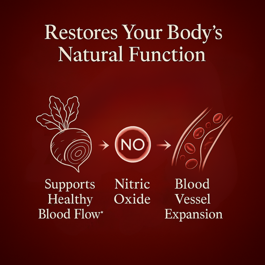 Fermented Beet & Maca works by supporting three critical systems that decline with age: circulation, hormone balance, and cellular energy. The fermented beet root provides dietary nitrates your body converts into nitric oxide — opening blood vessels and improving oxygen delivery. Maca is a powerful adaptogen that helps regulate cortisol and supports natural hormone balance. Together, they address root causes, not just symptoms.